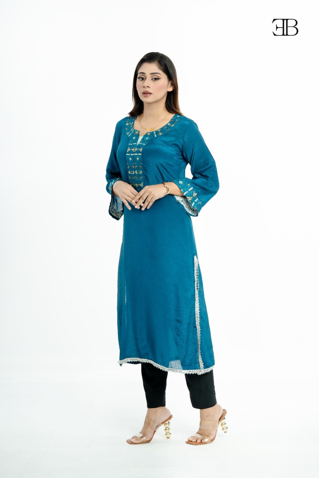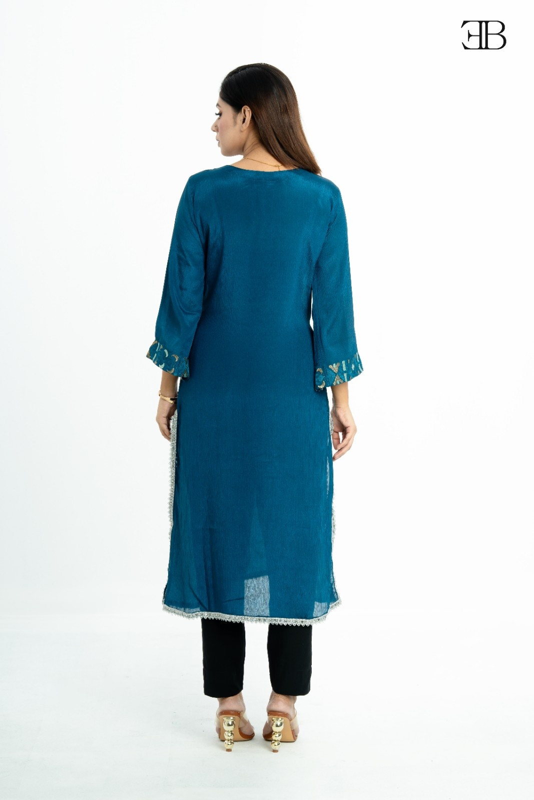 Elevate your wardrobe with this beautiful deep teal kurti, featuring intricate golden embroidery detailing on the neckline and sleeves, complemented by delicate silver lace on the hem. Crafted from a comfortable crepe fabric, its elegant design makes it an excellent choice for a formal event or simply a stylish day out.