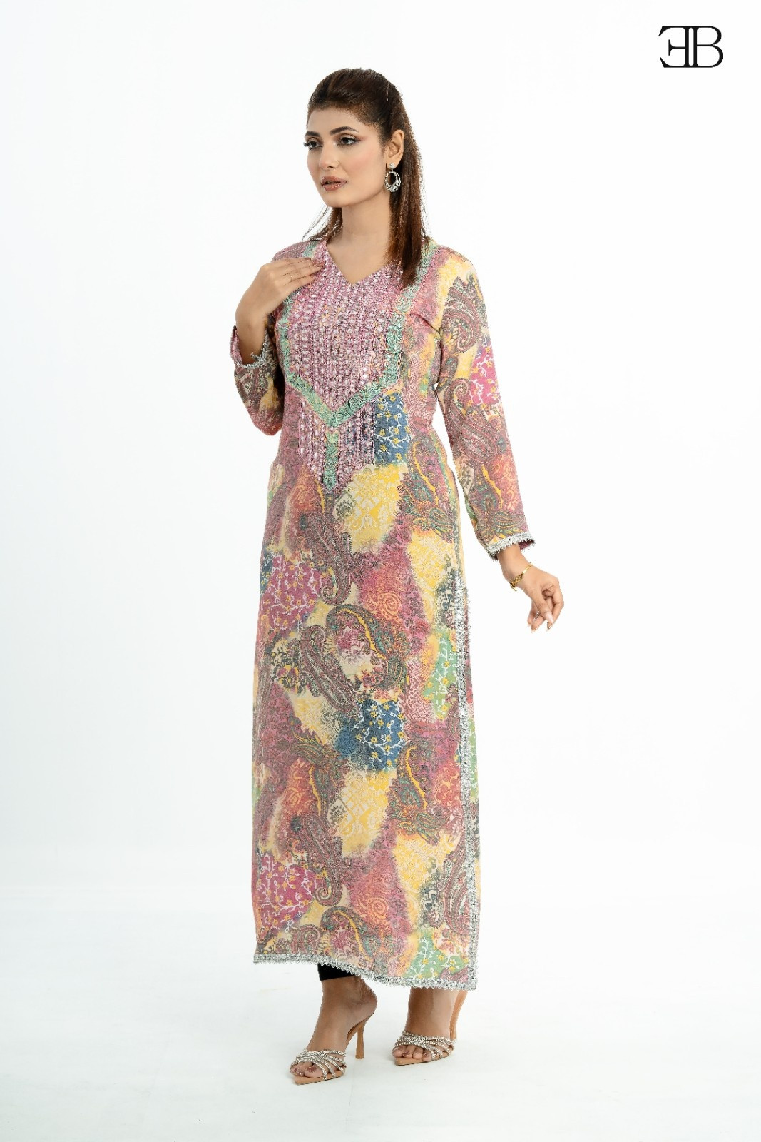 Elevate your wardrobe with this beautiful Pakistani-style long kurti featuring a vibrant, multi-color paisley print throughout. The yoke is richly detailed with subtle silver sequin and thread embroidery for a touch of sparkle. Its lightweight fabric and elegant maxi length, finished with silver lace on the hem, make it a lively and stylish choice for any festive occasion or a chic day out.