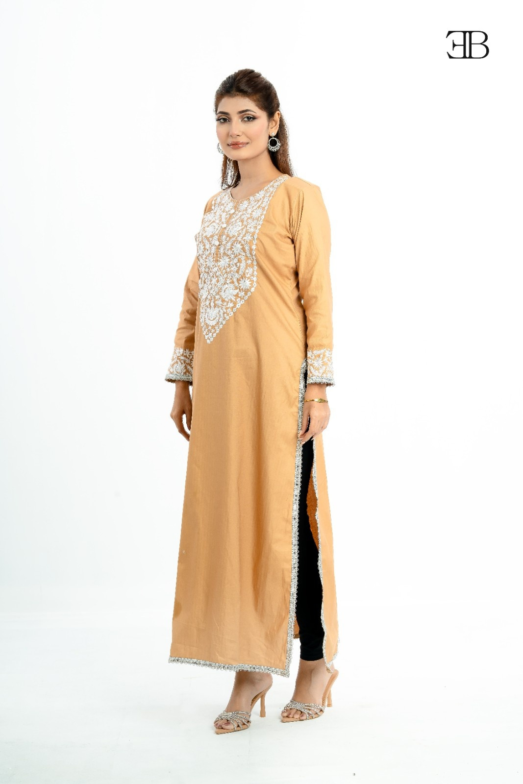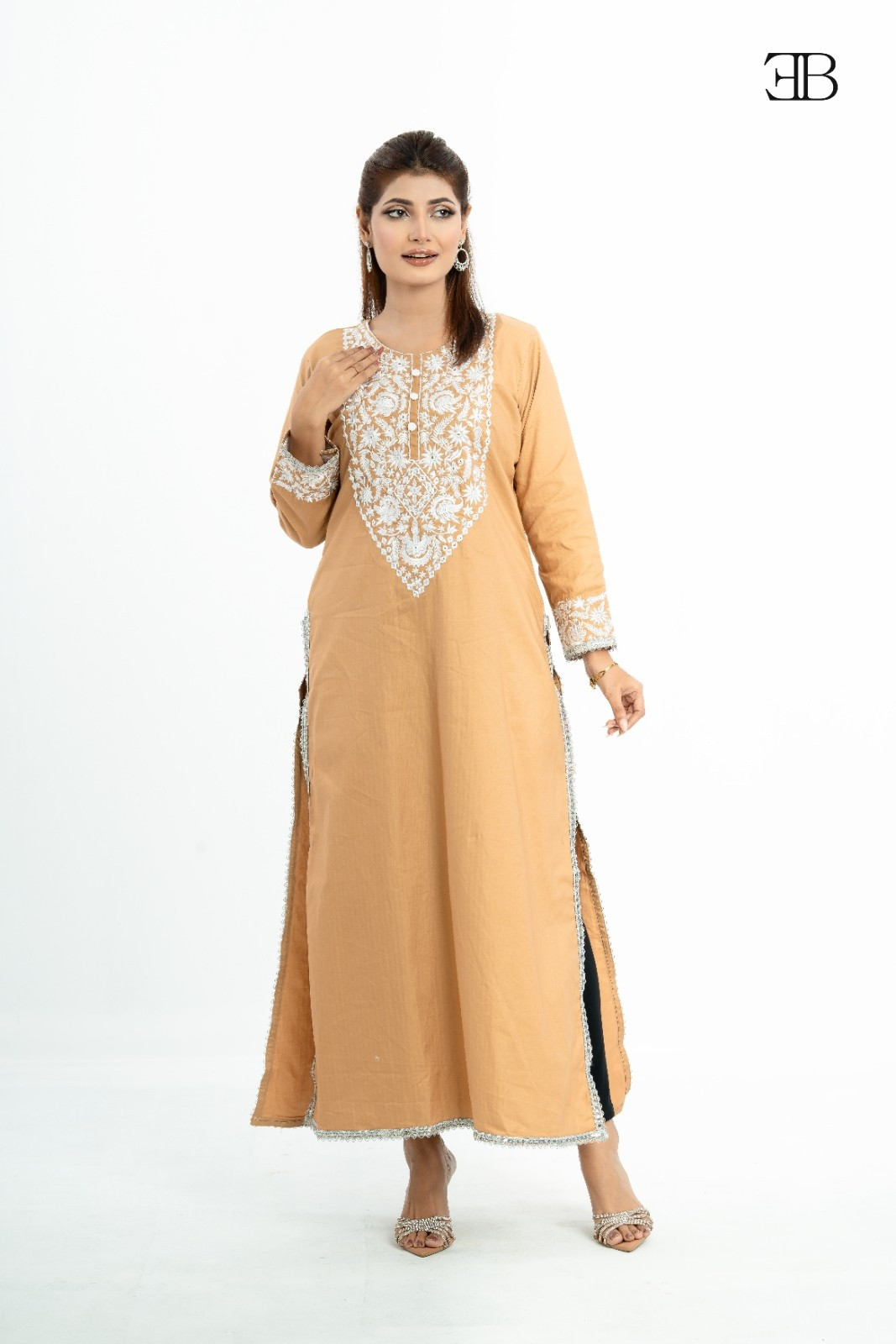 Elevate your wardrobe with this beautiful Pakistani-style long kurti in a warm camel tone, featuring intricate white Kashmiri-inspired Chikankari-style embroidery across the yoke and cuffs. Its comfortable fabric and floor-grazing length, finished with delicate silver lace on the hem and side slits, make it an elegant choice for a formal event or a stylish day out.